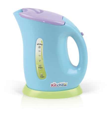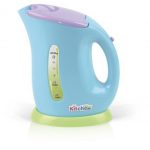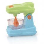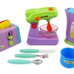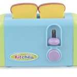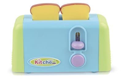This kitchen appliances playset is filled with fun. It has a toaster and 2 pieces of toast. Put the toast in the toaster, pull down the lever, push the button to watch the toast pop into the air. The mixer comes with a bowl. The head of the mixer is adjustable up and down. Pull the lever and the mixer stirs! The kettle has a lid that opens. 2 cups and 3 utensils are also included.