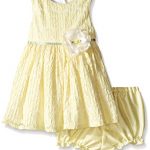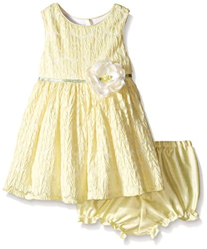 This cushy yellow get dressed is outlined with candy vegetation on a cushy heritage