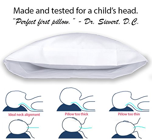 Chiropractor recommended as “perfect first pillow!” Size: 14in x 19in. Not too small, not too large. Contains a dense yet soft fiber so we will be able to use less filling than most toddler pillows to give the best neck toughen and prevent kinks or chiropractic visits.